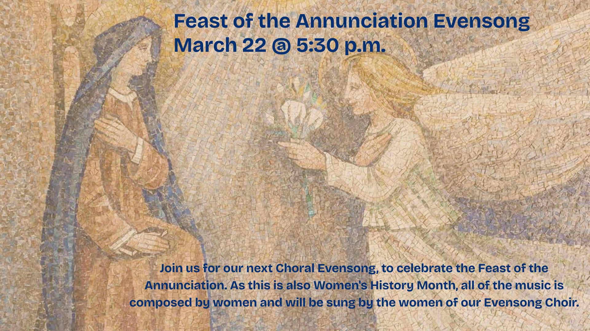 Please join us on March 22 at 5:30 p.m. for our next Choral Evensong, to celebrate the Feast of the Annunciation. As this is also Women's History Month, all of the music is composed by women and will be sung by the women of our Evensong Choir. Music by Ethel Smyth, Florence Price, Verena Lucia Anders, Rebecca Simantov, Sister Elise, Gemma McGregor, and Amy Beach.